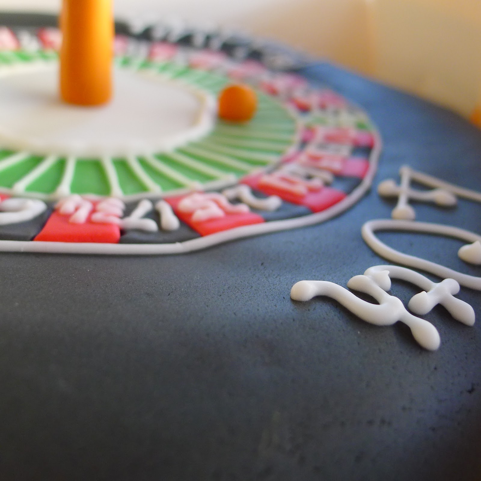 a 40th birthday casino themed party, to be topped off with a roulette wheel cake! the cake was a zesty zingy cake, filled and covered with lemon buttercream. Then decorated with hand rolled fondant and royal icing. At 12" the cake was large enough to feed 60-70 people.